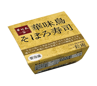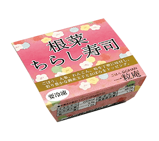 例えば「根菜ちらし寿司」は、直火釜で炊き上げた熟成米に酢を合わせ、職人がシャリ切りする工程から始まります。丁寧に味付した根菜と混ぜ合わせ出来上がったお寿司を、錦糸玉子とおぼろでんぶを敷いたトレーに一つずつ盛ります。出来立てを急速冷凍し、豊かな美味しさを閉じ込めています。心を込めて人の手で仕上げる。一粒庵の変わらぬこだわりです。