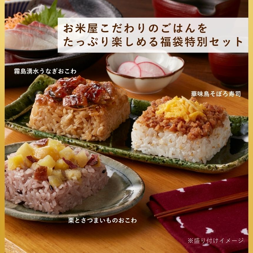 (黒豆と黒米のおこわ、とりごぼうおこわ、栗とさつまいものおこわ、霧島湧水うなぎおこわ、桜えびと高菜のごはん、ぶり照焼きごはん、黒毛和牛焼肉ごはん、根菜ちらし寿司、華味鳥そぼろ寿司×各1個、とらふぐおこわ×3個)